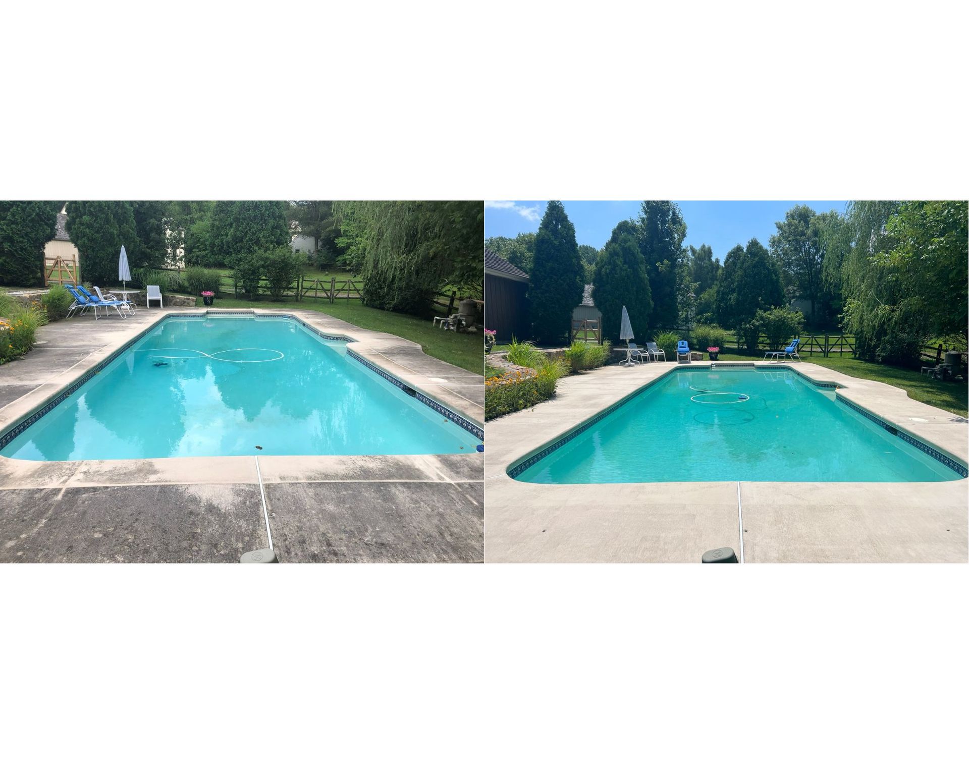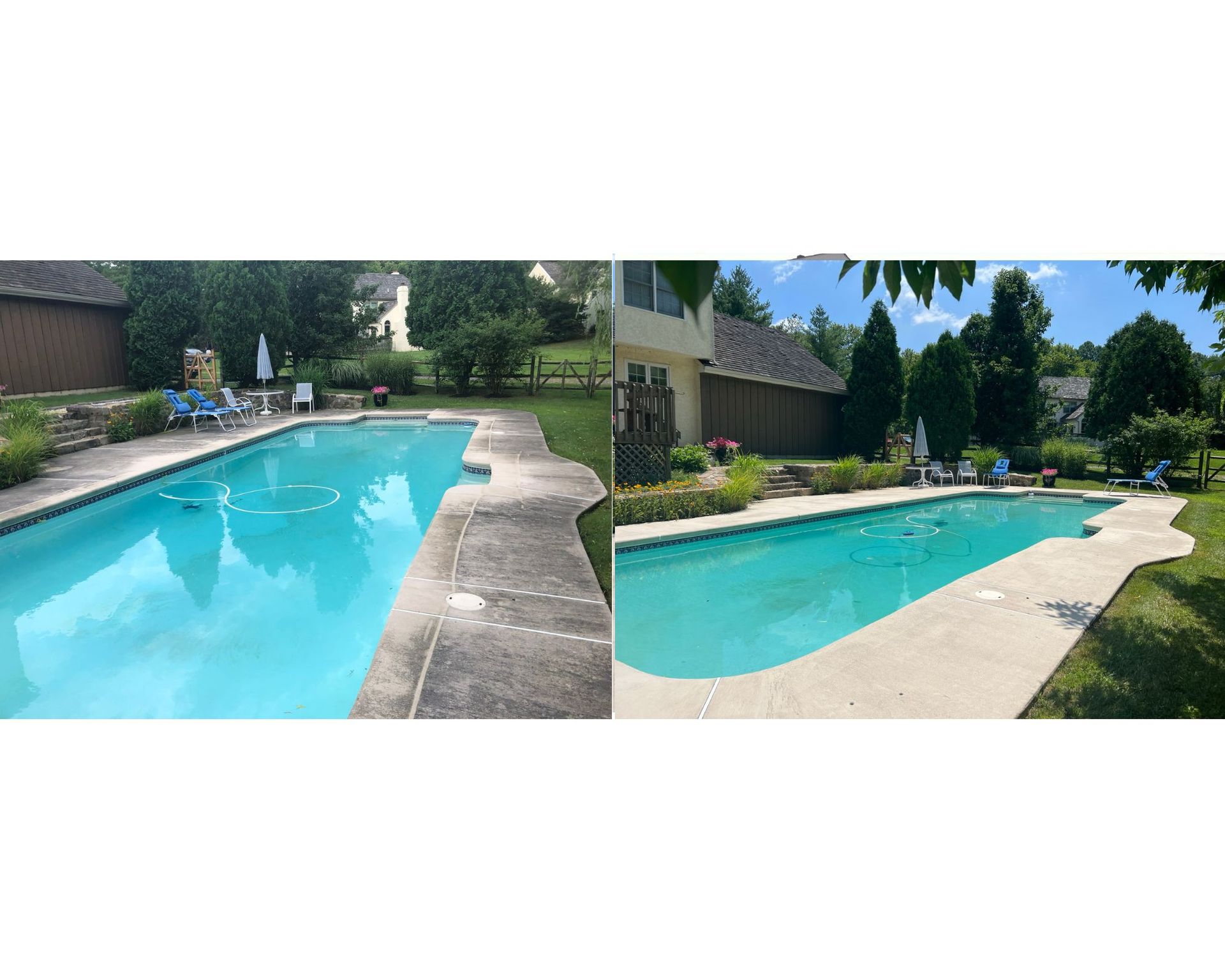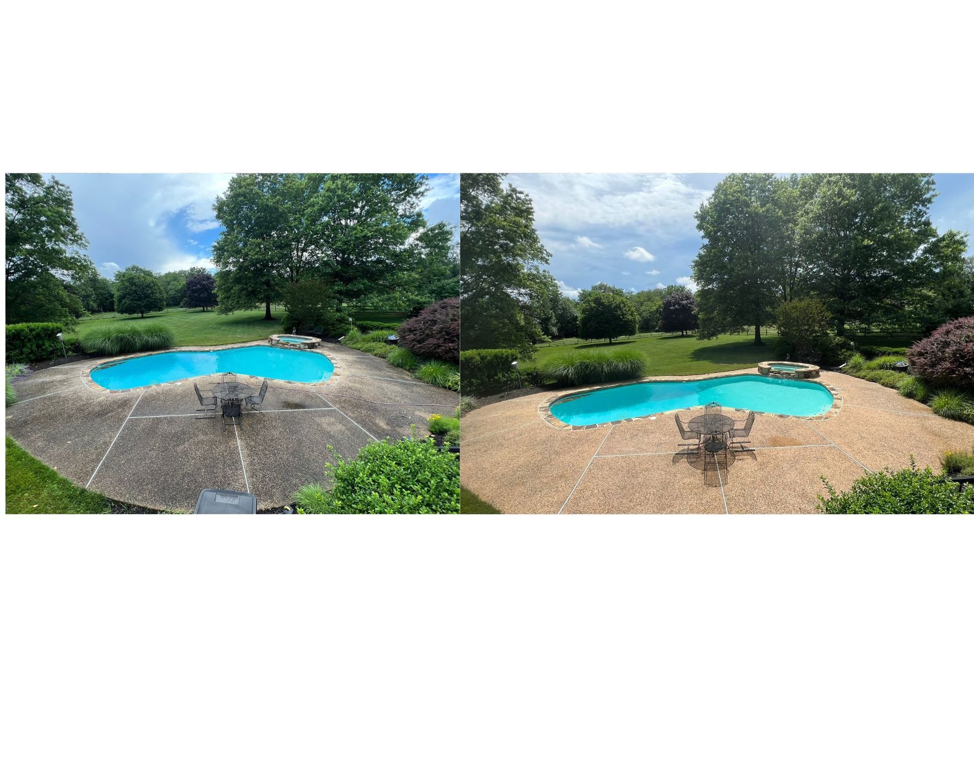 For most pool decks in the Chester County area, we recommend a professional cleaning once every 1–2 years. Properties surrounded by heavy tree cover or in shaded areas may benefit from annual cleaning, as algae and mold growth can develop faster in those conditions.